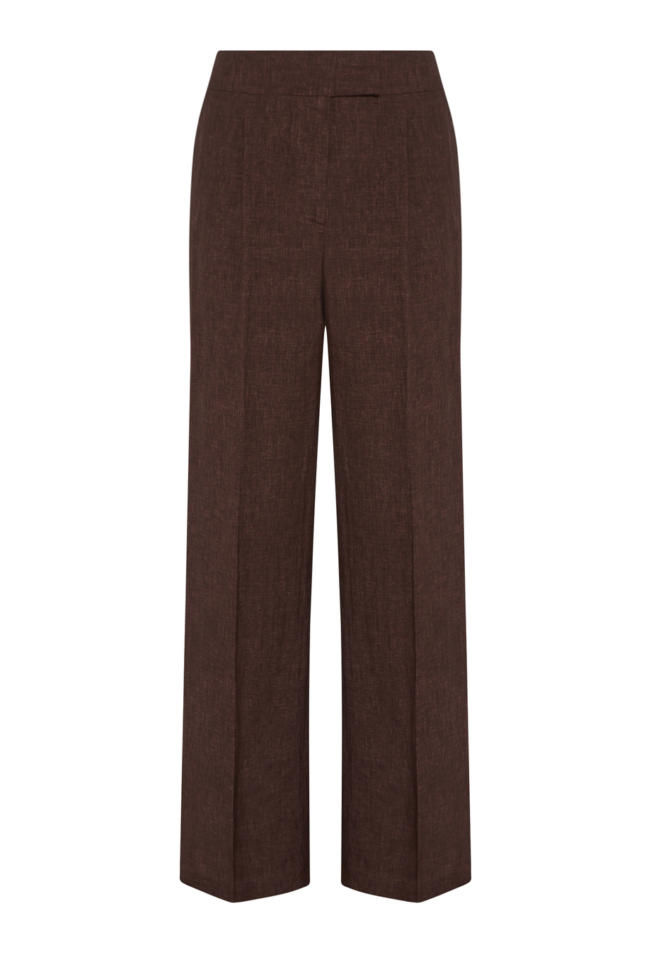 Spodnie z wysokim stanem uszyte z lnu. Szeroka nogawka, zapięcie na suwak, haczyk i guzik corozo od środka. Wnętrze z ozdobną lamówką. Kieszenie. Kolor brązowy. Do uzupełnienia zestawu żakiet z tej samej tkaniny.
