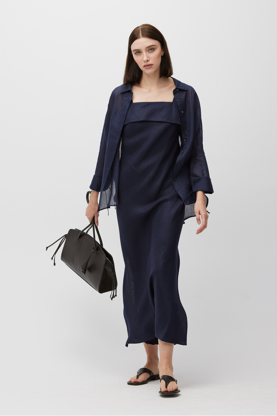 Granatowa sukienka z lnu. Kwadratowy dekolt. Fason bliżej ciała. Długość midi, rozcięcia po bokach. Zapięcie na plecach. Ozdobne wykończenie w środku. Do uzupełninia zestawu koszula z ramii w tym samym kolorze.