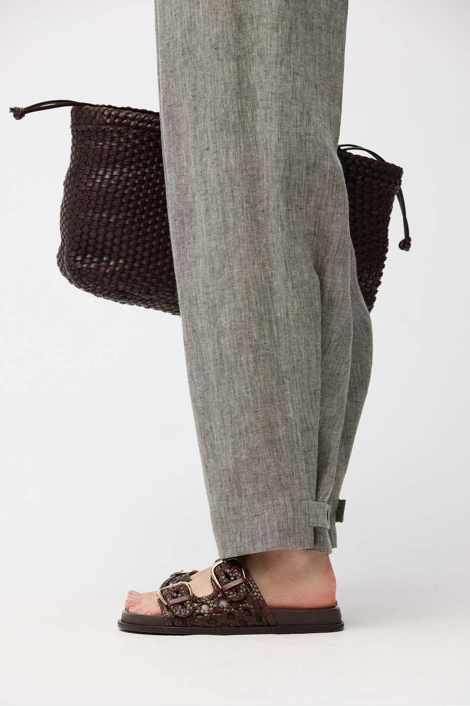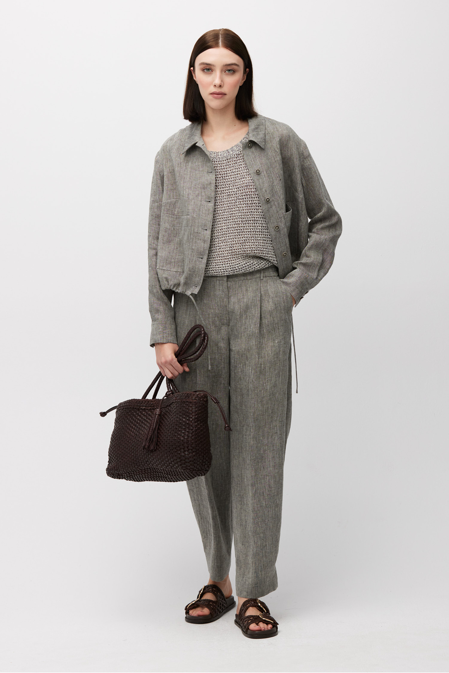 Szare spodnie z lnu z zakładkami. Szeroka nogawka z możliwością podpięcia z tyłu. Zapięcie na suwak, haczyk i guzik corozo od środka. Wnętrze z ozdobną lamówką. Kieszenie. Do uzupełnienia zestawu żakiet z tej samej tkaniny.