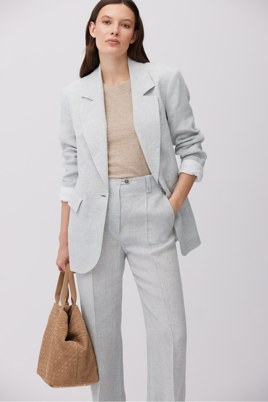 Lniany żakiet z lnu. Jednorzędowy. Fason regularny. Długi rękaw, kieszenie. Półpodszewka, wewnątrz ozdobny piping. Do uzupełninia zestawu spodnie z tej samej tkaniny. Kolor błękitny.