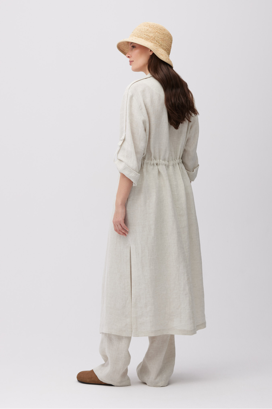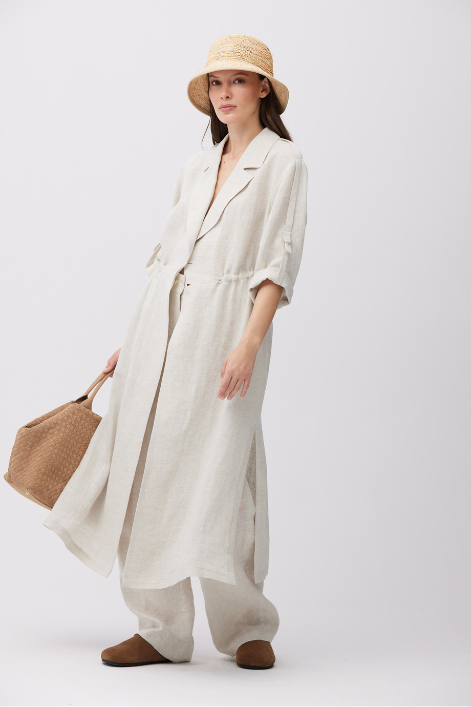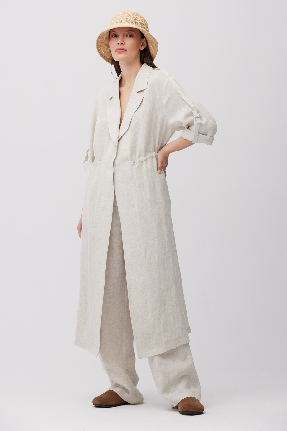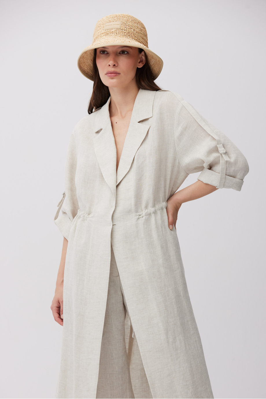 Beżowy, długi żakiet z lnu. Kołnierz, zapięcie na guzik. Długi rękaw z możliwością podpięcia. Regulacja w talii. Kieszenie. Po bokach rozcięcia. Do uzupełninia zestawu, spodnie z tej samej tkaniny.