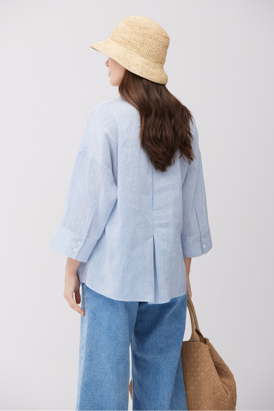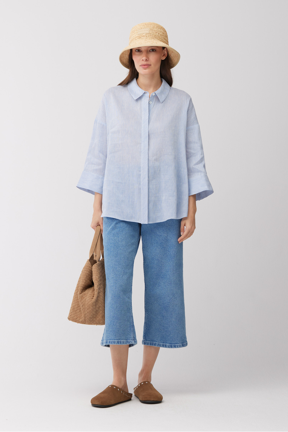 Koszula w paski z mieszanki lnu i jedwabiu. Kołnierz, zapięcie na guziki w krytej listwie, rękaw 3/4. Luźna forma.