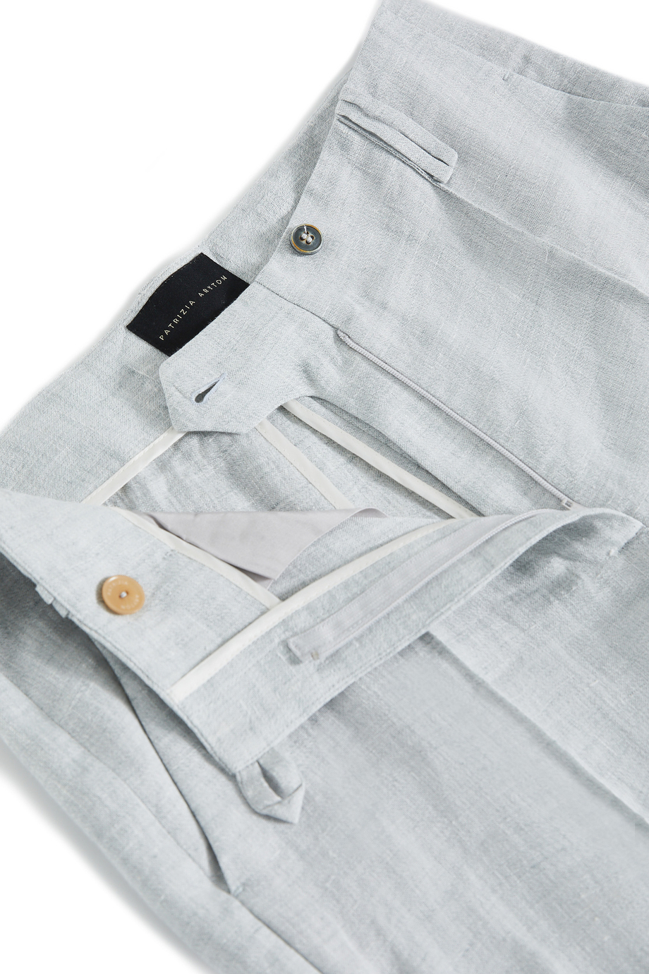 Spodnie z wysokim stanem uszyte z lnu. Szeroka nogawka, zapięcie na suwak, haczyk i guzik corozo od środka. Wnętrze z ozdobną lamówką. Kieszenie. Kolor błekitny. Do uzupełnienia zestawu żakiet z tej samej tkaniny.