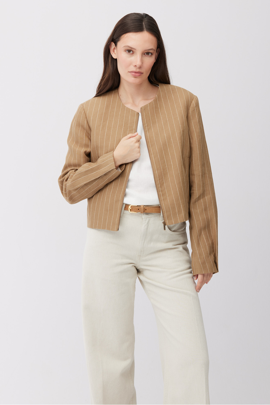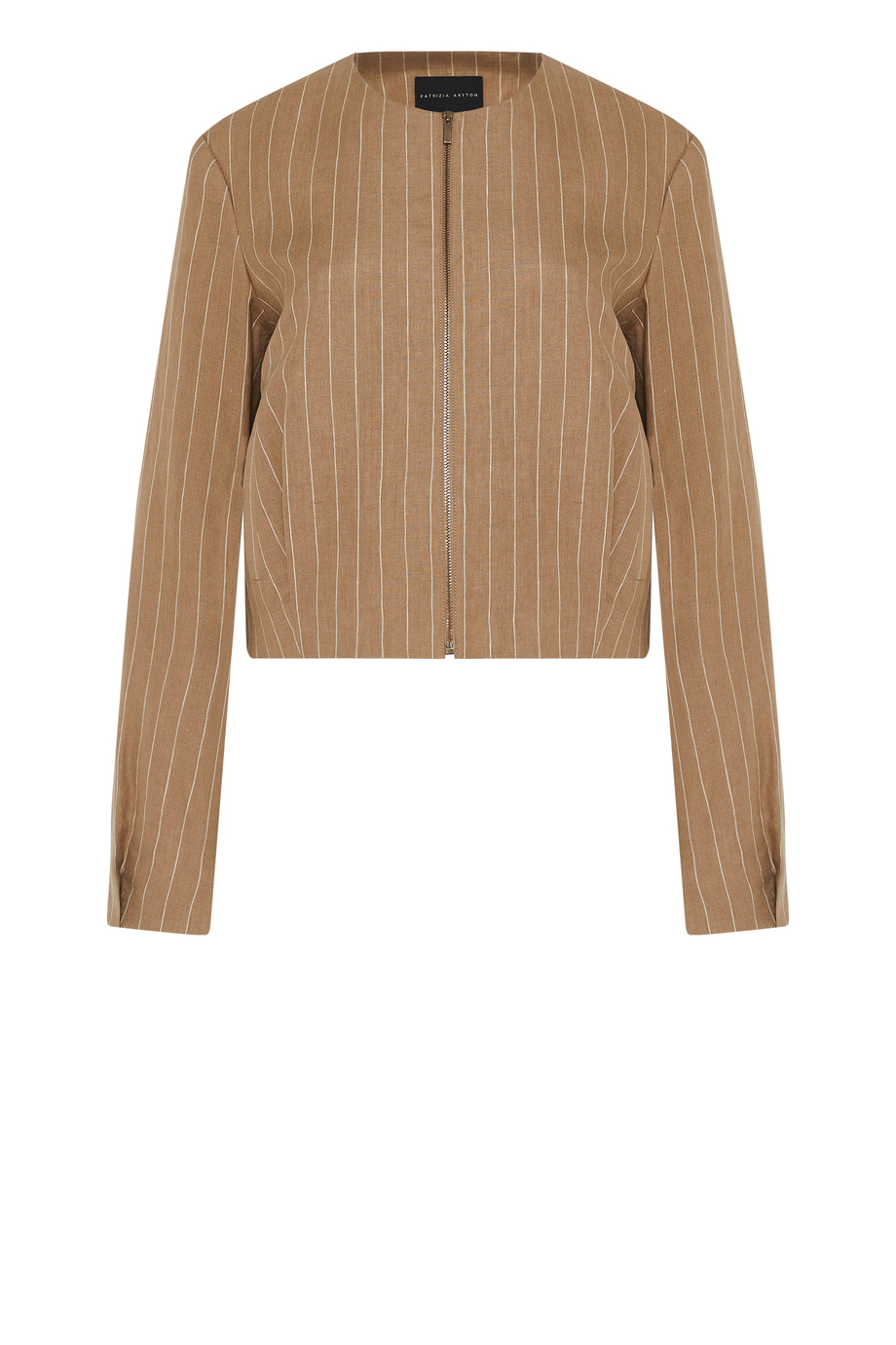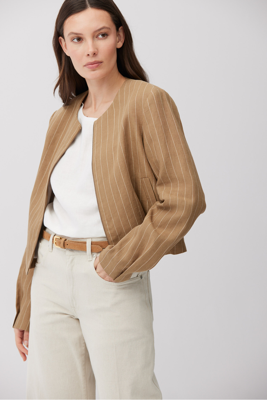 Lniany żakiet w tenis. Fason pudełkowy, długi rękaw, zapięcie na suwak. Kieszenie. Model na podszewce, z ozdobnym stebnowaniem i pipingiem od środka. Kolor camel.