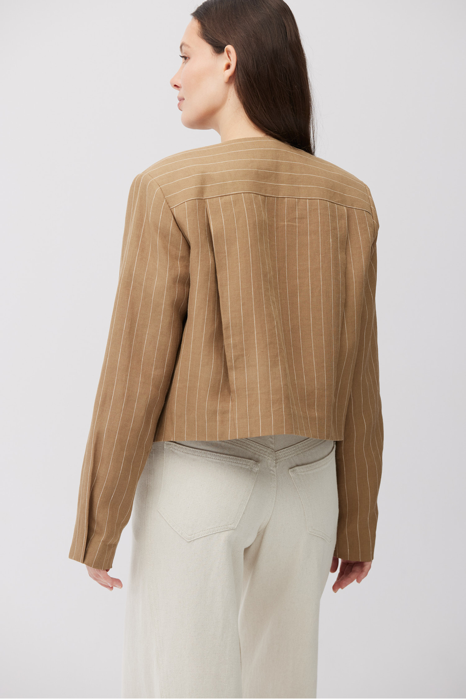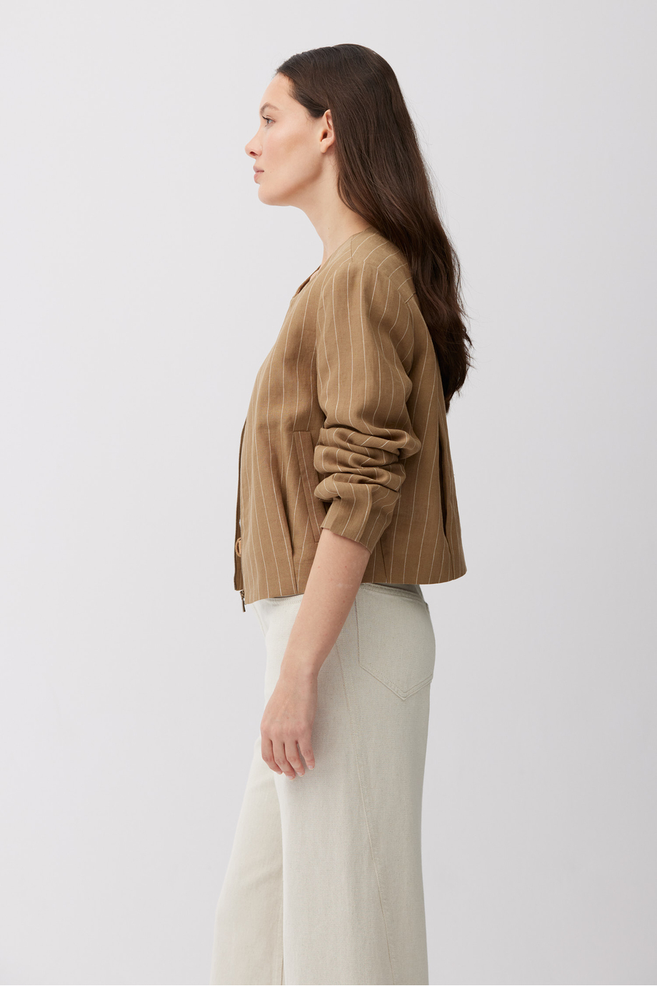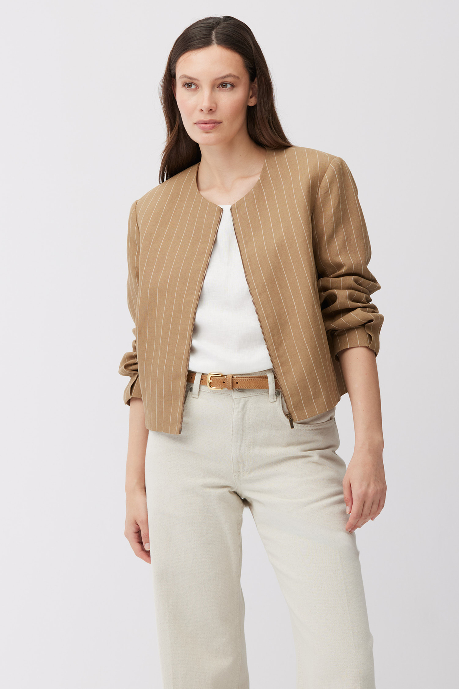 Lniany żakiet w tenis. Fason pudełkowy, długi rękaw, zapięcie na suwak. Kieszenie. Model na podszewce, z ozdobnym stebnowaniem i pipingiem od środka. Kolor camel.